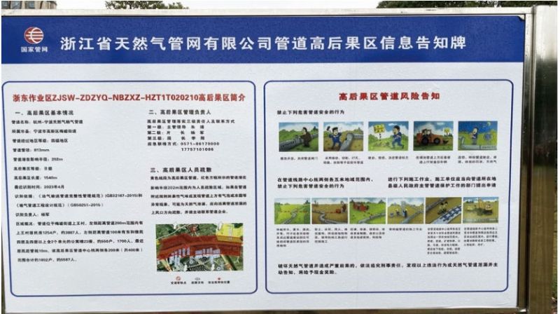 (2)開(kāi)展精準宣傳。專(zhuān)職區長(cháng)與巡線(xiàn)人員按規定對高后果區開(kāi)展精準宣傳工作,發(fā)放管道保護宣傳品,提高高后果區周邊人員管道保護及應急逃生意識。每處高后果區均設置有高后果區告知牌和安全提示牌(圖 1),明確管道周邊、核心保護區內危害管道的各類(lèi)行為和特定施工作業(yè)需辦理的許可手續等。