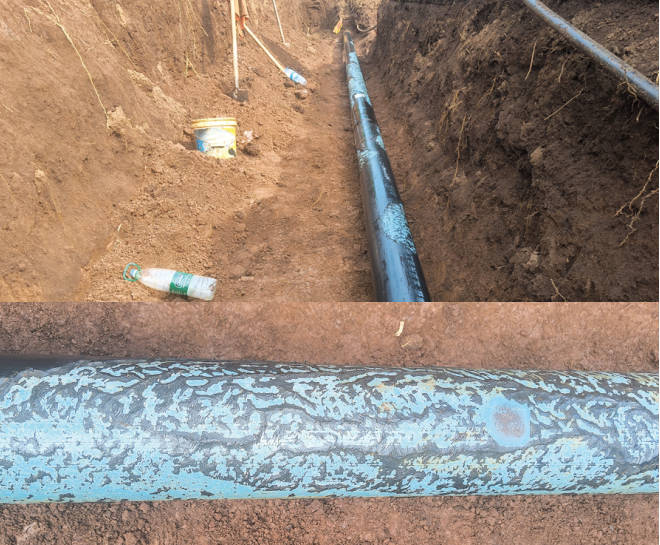 2025年7月,公司在蓮花支線(xiàn)外防腐層檢測中發(fā)現一處70 dB的防腐層缺陷點(diǎn)信號,同步對該段CIPS測量的陰保數據進(jìn)行分析,表明此處陰極保護電位顯著(zhù)偏正(圖 3)。經(jīng)開(kāi)挖長(cháng)約13m管道,顯見(jiàn)其中8 m左右的管道防腐層受損,面積達1.9 m2(圖 4)。開(kāi)挖過(guò)程中發(fā)現與管道平行分布有竹鼠洞穴,并且在土壤中散落大量環(huán)氧粉末底漆碎末,且防腐層破損邊緣呈現明顯的竹鼠啃咬齒痕。經(jīng)采用“粘彈體+冷纏帶”的方式對該段防腐層進(jìn)行修復,對暴露出來(lái)的硅管用角鋼進(jìn)行包裹,并在回填的土壤里和經(jīng)過(guò)竹林的管段周邊灑上驅鼠藥劑。一段時(shí)間后再次對該段管道進(jìn)行外防腐層檢測,未發(fā)現新的防腐層缺陷點(diǎn)信號。