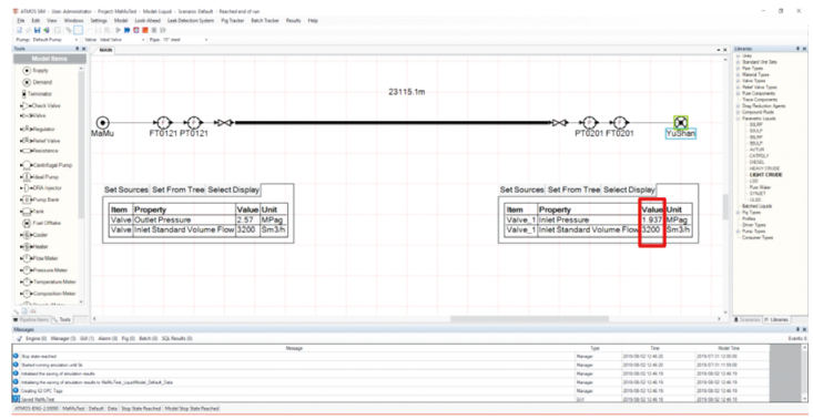 為了進(jìn)一步驗證輸油管道當前的運行狀態(tài),使用模擬仿真系統建立了原油管道的模型(圖 9)并進(jìn)行相關(guān)的分析,根據當前輸油管道的工況,設定輸量為 3200 m³/h,馬目首站出站壓力為2.57 MPa,如果是正常原油滿(mǎn)管輸送操作模式下,計算出魚(yú)山末站進(jìn)站壓力應該保持在1.97 MPa。