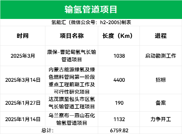 2024年輸氫管道方面動(dòng)作頻頻,2025年,國家與地方發(fā)布多項政策支持輸氫管道建設與試點(diǎn)應用,從開(kāi)年至今,多個(gè)項目與技術(shù)取得進(jìn)展,這些項目建設里程將近6800km,工程規?胺Q(chēng)很大。