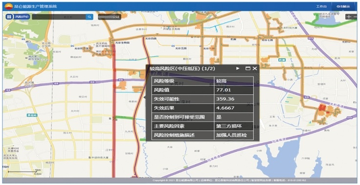 (3)風(fēng)險評價(jià)與隱患識別。主要采用半定量評價(jià)標準開(kāi)展風(fēng)險評價(jià),根據所選管段屬性和周邊環(huán)境情況,將管段劃分為不同單元,結合對應的風(fēng)險評價(jià)指標進(jìn)行打分,依據風(fēng)險評分計算模型得出各單元管段相對風(fēng)險值。通過(guò)在系統內建立風(fēng)險評價(jià)模型,實(shí)現逐條管線(xiàn)在線(xiàn)精準評價(jià)(圖 3),使以往操作復雜的風(fēng)險評價(jià)方法得以在線(xiàn)大量實(shí)踐應用,在系統內生成快捷、便利的自動(dòng)測評結果展示。評價(jià)完成后GIS地圖直觀(guān)生成全公司風(fēng)險展示圖(圖 4)。同時(shí)總結梳理管道典型隱患/失效類(lèi)型,制定隱患分級判定企業(yè)標準,推動(dòng)風(fēng)險隱患科學(xué)識別,并開(kāi)發(fā)系統模型實(shí)施線(xiàn)上評價(jià)。