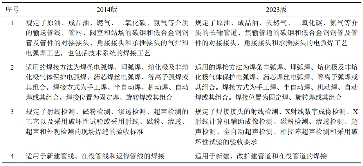 相對于2014版,2023版適用的管道介質(zhì)范圍有所縮小,輸送介質(zhì)將原“燃氣”修改為“天然氣”,排除了氫氣等其他燃氣。檢測方法增加了X射線(xiàn)數字成像檢測、X射線(xiàn)計算機輔助成像檢測、全自動(dòng)超聲檢測、相控陣超聲檢測等數字化無(wú)損檢測方法,適應當前油氣管道建設數字化交付的需求。適用的管道類(lèi)型為長(cháng)輸管道和集輸管道,刪除了閥室和站場(chǎng)的工藝管道。增加了改擴建管道,刪除了返修管線(xiàn)。在附錄B中針對在役管道焊接給出了清晰的界限,即含有輸送介質(zhì)的帶壓或不帶壓、流動(dòng)或不流動(dòng)的管道系統,在該管道系統中與外管壁直接接觸、熔合的焊接操作。