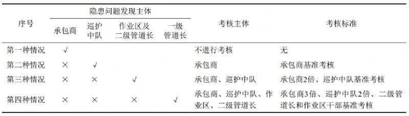 健全體系,發(fā)揮追責“連環(huán)扣”作用。建立一級管道長(cháng)、二級管道長(cháng)、管道運維隊和業(yè)務(wù)承包商逐級監督機制,以及遞增式考核的追責體系(表 1),通過(guò)逐級“加碼”、壓力傳導,激勵各層級主動(dòng)發(fā)現和處理問(wèn)題,有效提升各自安全責任意識和擔當意識。
