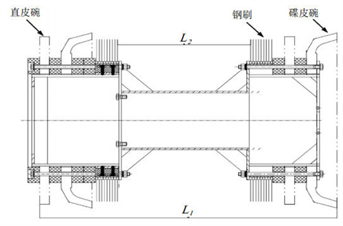 (3)增大清管器前、后段間距,減小清管器總長(cháng)度,并避免多個(gè)直皮碗、鋼刷相鄰組裝。由于直皮碗和鋼刷內圈的倒伏能力較差,如果不加隔離墊而相鄰組裝,其變形能力變差,導致清管器整體通過(guò)性變差。